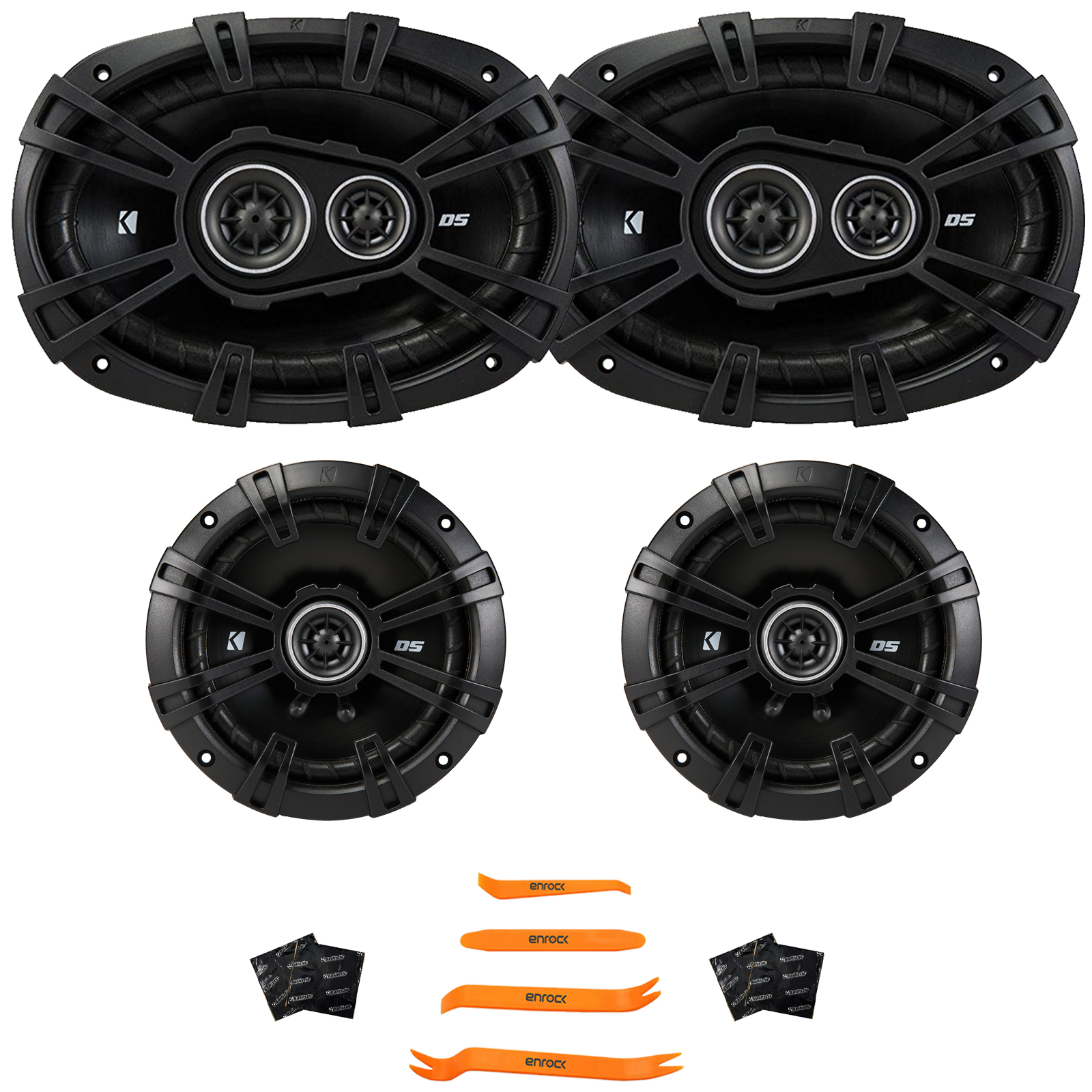 PACKAGE BUNDLE INCLUDES: 2x Kicker 43DSC69304 D-Series 6x9" 360 Watt Max Power 3-Way Coaxial Car Audio Speakers, 2x Kicker 43DSC6504 6.5" 240 Watt Max Power 2-Way 4-Ohm Coaxial Automotive Speakers, 4x Speaker Sound Deadening Material For Car Speakers, 4-Piece Trim Removal Pry Tool Set