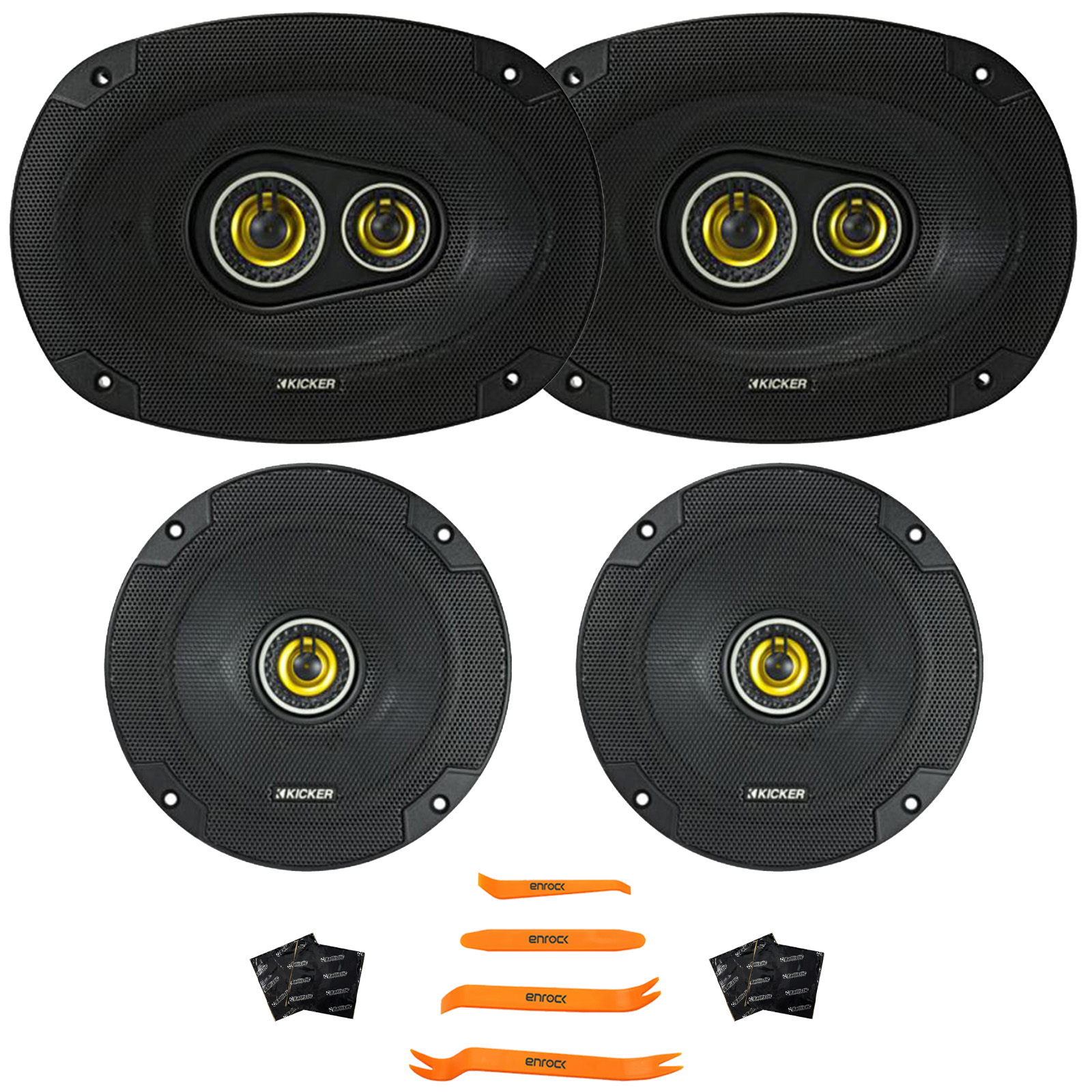 PACKAGE BUNDLE INCLUDES: 2x Kicker CS Series 46CSC6934 6x9" 450 Watt Max Power Coaxial Car Audio Black Speakers, 2x Kicker CSC65 CS Series 6.5" 300 Watt Max Power 4 Ohm 2-Way Coaxial Automotive Speakers, 4x Speaker Sound Deadening Material For Car Speakers, 4-Piece Trim Removal Pry Tool Set