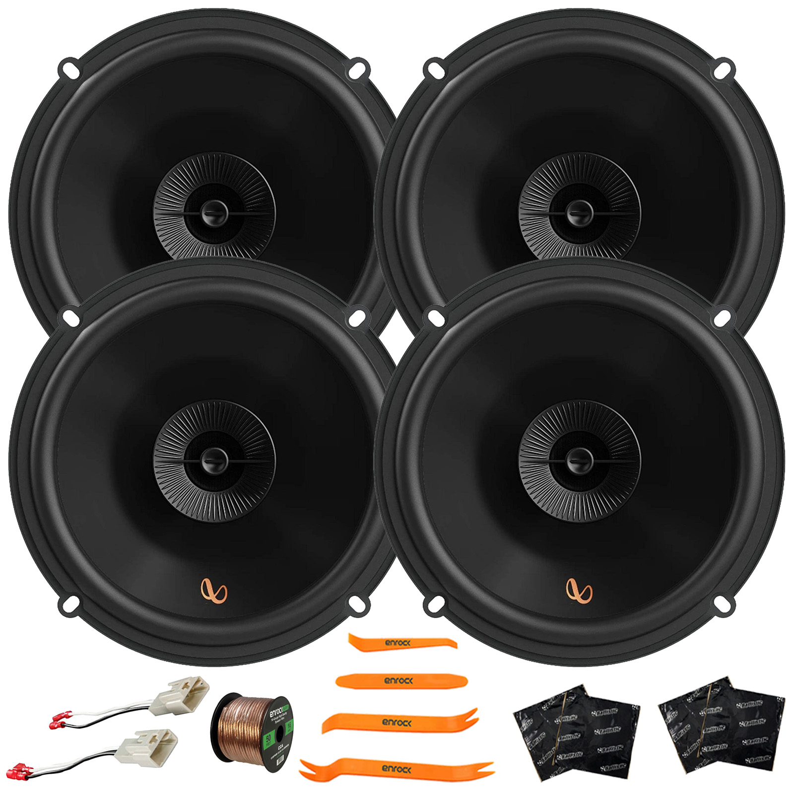 PACKAGE BUNDLE INCLUDES: 4x Infinity Primus Series PR603F 6.5" 150 Watt Max Power 2-Way Multi-Element Car Audio Speakers, 2x Speaker Connector, 50 Feet 16 Gauge Speaker Wire, 4x Speaker Sound Deadening Material For Car Speakers, 4-Piece Trim Removal Pry Tool Set (Bundle Fits For Select Toyota Vehicles)
