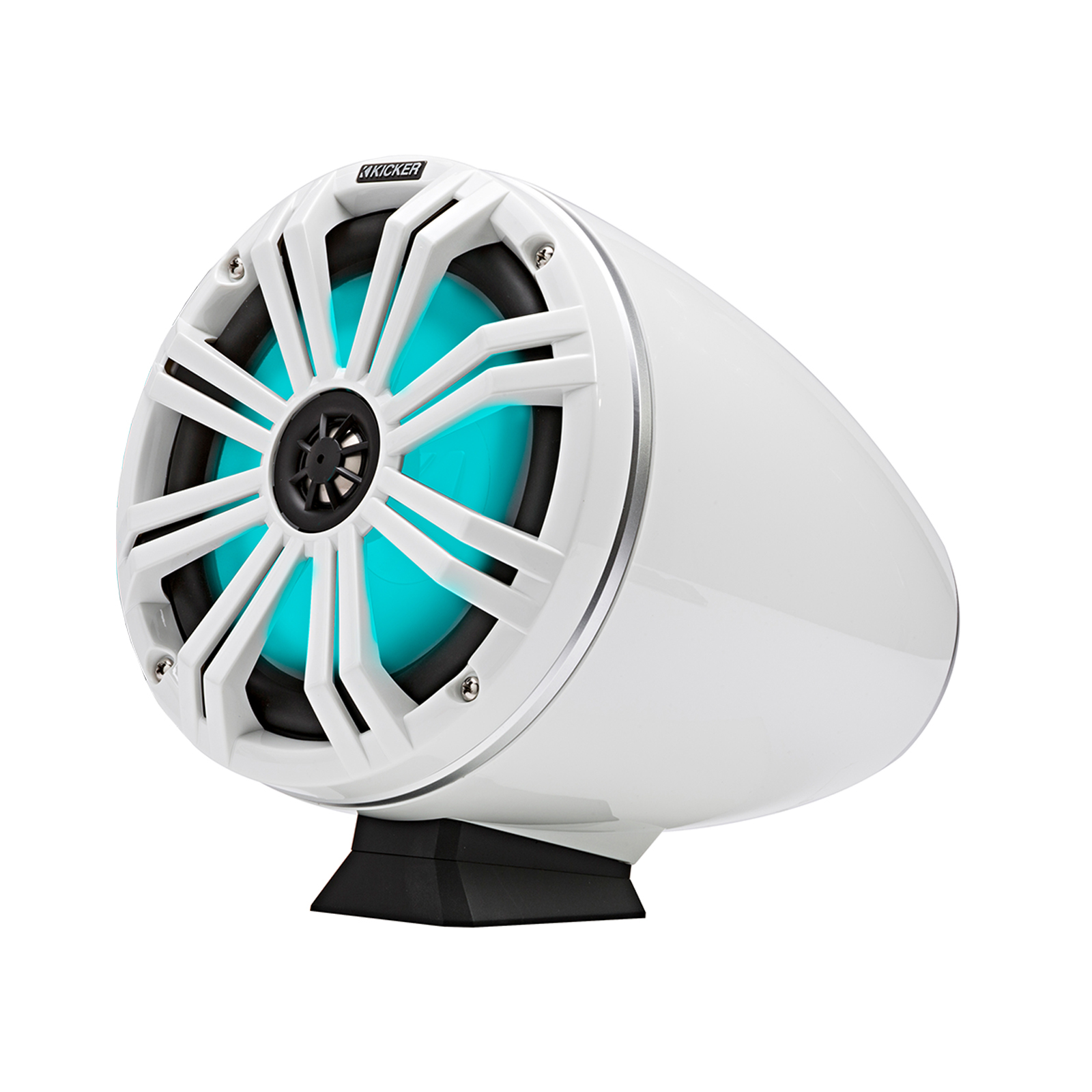 The Kicker 8" Coaxial Tower Speaker System is UV treated for protection against the sun, includes 7 color LED grille system which is upgradeable to 20 Colors and 19 Lighting Modes with the KMLC remote control (sold seperately) and 300 Watt Max peak power handling. ASTM G154 400 hr. Accelerated UV Test. ASTM B117 200 hr. Salt Fog Test