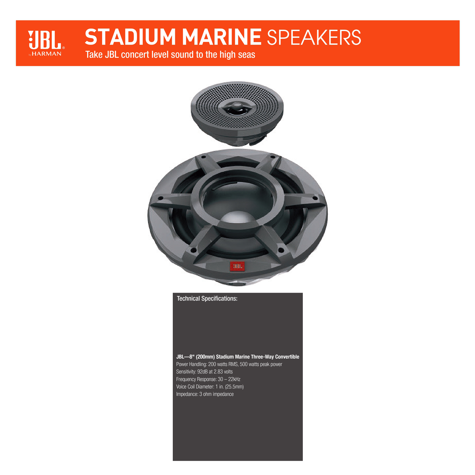 JBL's Stadium Marine loudspeakers leverage JBL’s world class audio engineering and music reproduction with purpose-built marine loudspeakers that will survive the rigors of the harsh marine environment. Choose from the most popular sizes for boats and watercraft. The 6.5" coaxial, 8" three-way convertible speaker system and 10" woofer have Plus One polypropylene woofer and midrange cones, Mylar tweeter domes (Except Subwoofer), one piece cast polymer baskets, sealed magnets, and rubber woofer surrounds for high SPL performance. Wind, water or engine noise will not drown them out. Speakers are UV resistant in a marine grade IPX3 (IPX5 from front) weather resistant and include RGB perimeter illumination and go through 300 hours of salt spray testing. And they're ready to make amazing music on the water. Whether it's a daily scrub down, a picnic in a quiet cove or an all-out race across high swells, JBL has the right configuration for your craft.