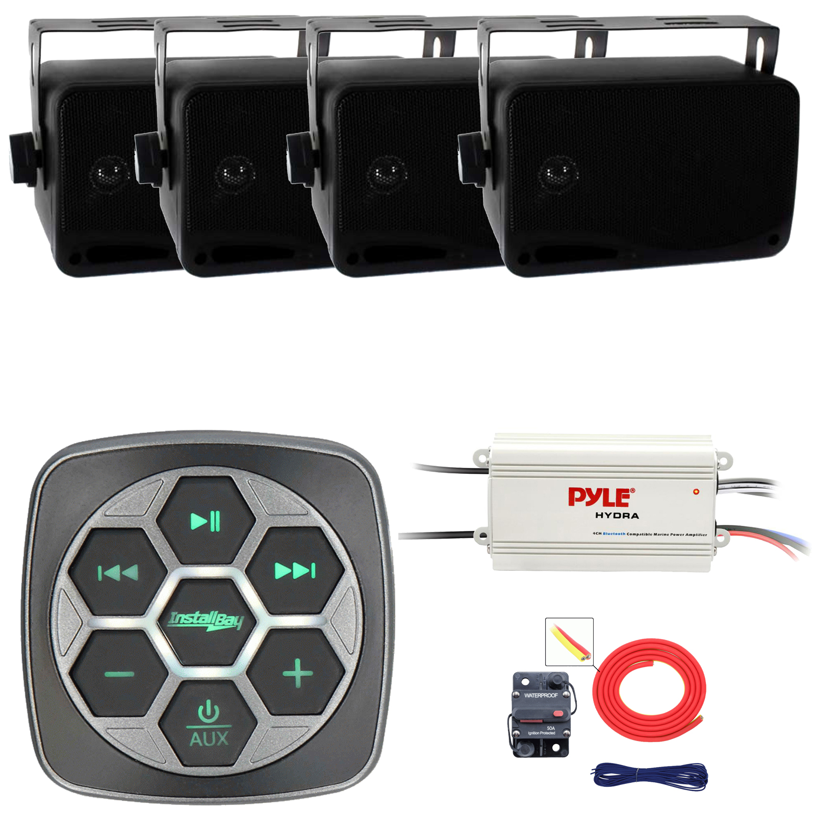 PACKAGE BUNDLE INCLUDES: Metra IBBTR19 Marine Bluetooth 3-Zone Controller, 4x Pyle PLMR24B 3.5'' 200 Watt Max Power 3-Way Indoor/Outdoor Wall Mount Boat Audio Black Speakers, Pyle PLMRMB4CW 4-Channel Waterproof Bluetooth Amplifier, 8 Gauge Amplifier Installation Kit
