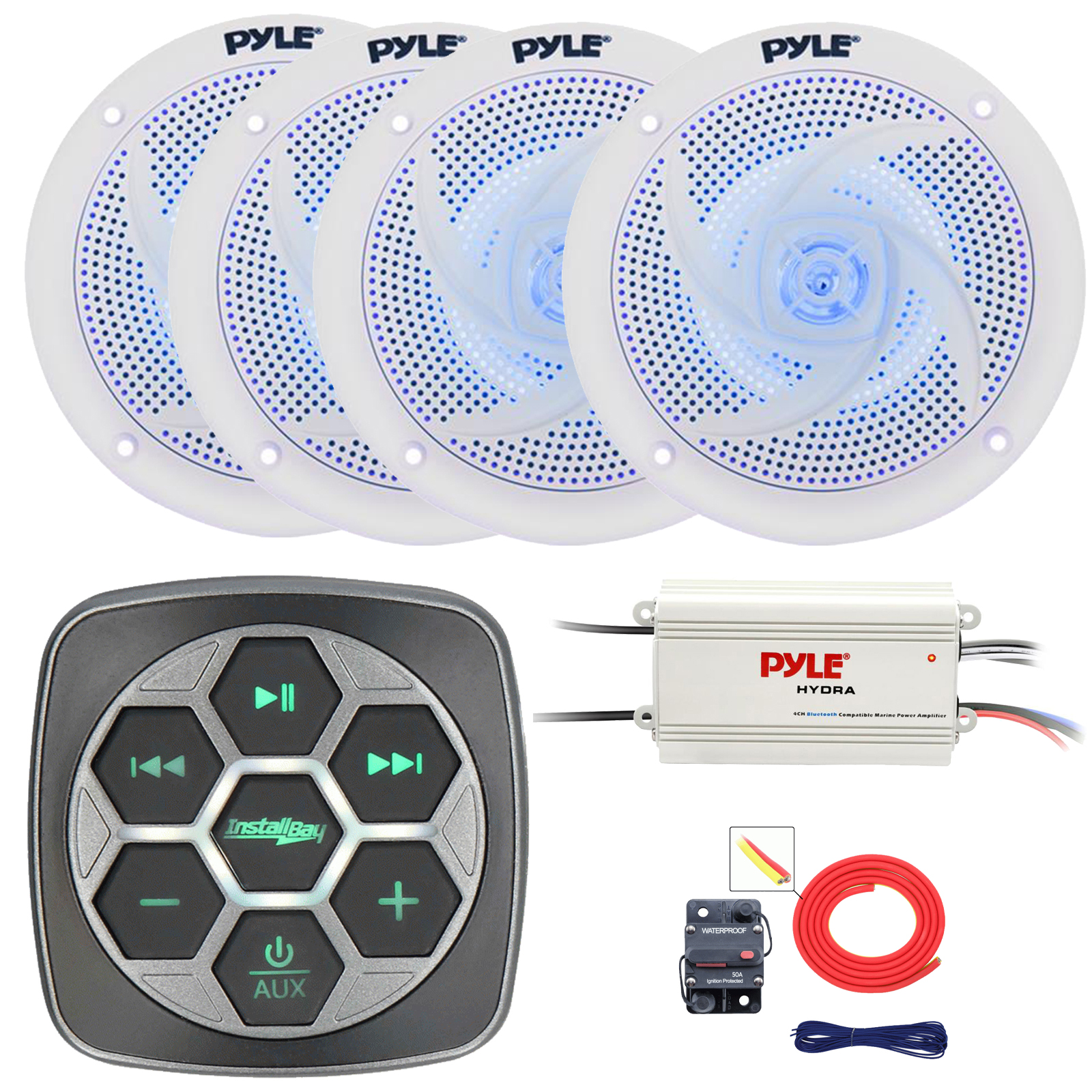 PACKAGE BUNDLE INCLUDES: Metra IBBTR19 Marine Bluetooth 3-Zone Controller, 4x Pyle PLMRS43WL 4" 100 Watt Max Power Low Profile 2-Way Blue Light LED Boat Audio White Speakers, Pyle PLMRMB4CW 4-Channel Waterproof Bluetooth Amplifier, 8 Gauge Amplifier Installation Kit