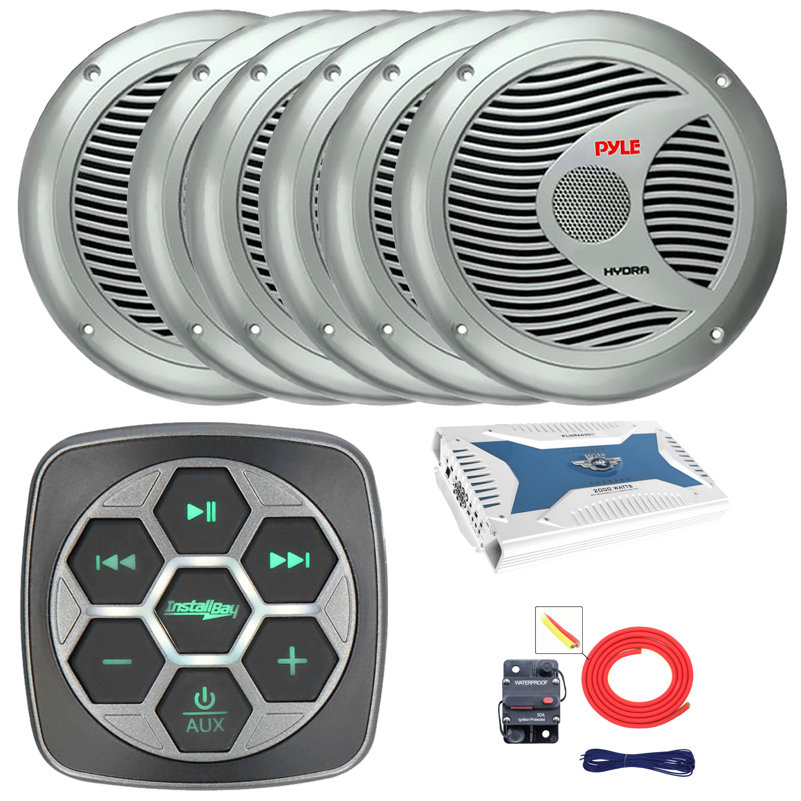 PACKAGE BUNDLE INCLUDES: Metra IBBTR19 Marine Bluetooth 3-Zone Controller, 6x Pyle PLMR60S 6.5'' 150 Watt Max Power 2 Way Boat Silver Speakers, Pyle PLMRA630BT 6-Channel 2000 Watt Bluetooth Amplifier, 8 Gauge Amplifier Installation Kit