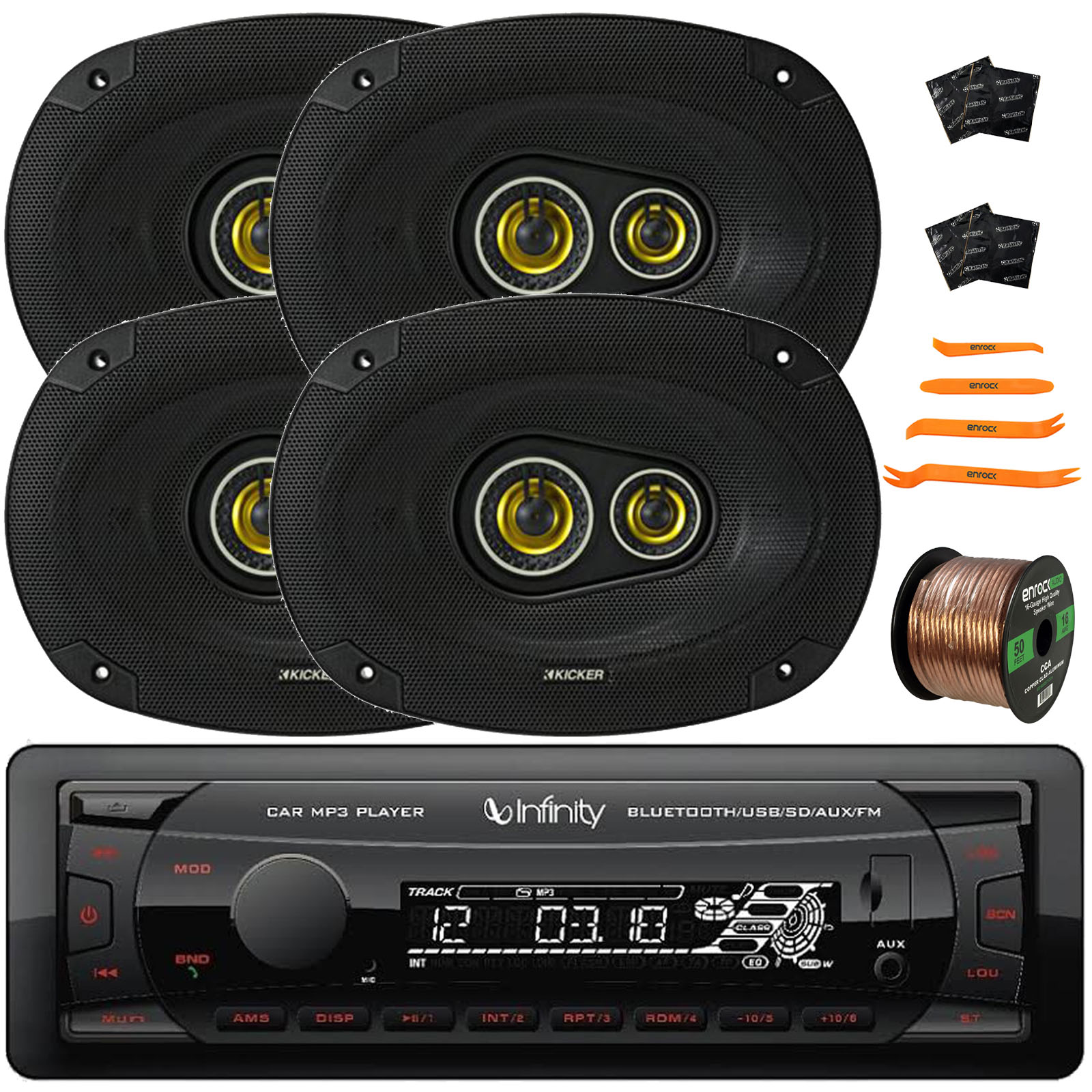 PACKAGE BUNDLE INCLUDES: Infinity Alpha 100 Single DIN Bluetooth USB/AUX SD FM Radio MP3 Player Digital Media Car Audio Receiver, 4x Kicker CS Series 46CSC6934 6x9" 450 Watt Max Power Coaxial Automotive Black Speakers, 50 Feet 16 Gauge Speaker Wire, 4x Speaker Sound Deadening Material For Car Speakers, 4-Piece Trim Removal Pry Tool Set
