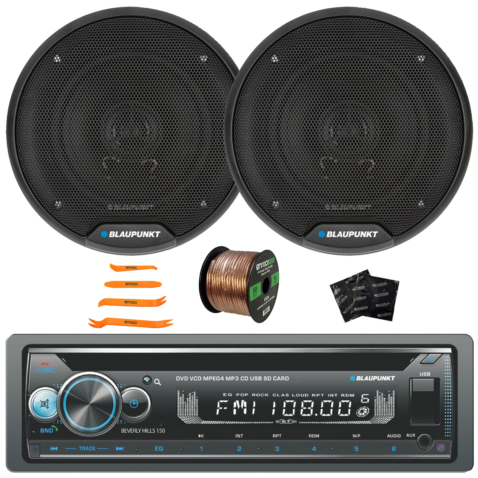 PACKAGE BUNDLE INCLUDES: Blaupunkt Beverly Hills 150 Single DIN Detachable Faceplate Bluetooth DVD/CD Player AM/FM Radio Stereo Receiver, 2x Blaupunkt BPS-E552 5" 40 Watt Max Power 2-Way Automotive Speakers, 50 Feet 16 Gauge Speaker Wire, 2x Speaker Sound Deadening Material For Car Speakers, 4-Piece Trim Removal Pry Tool Set