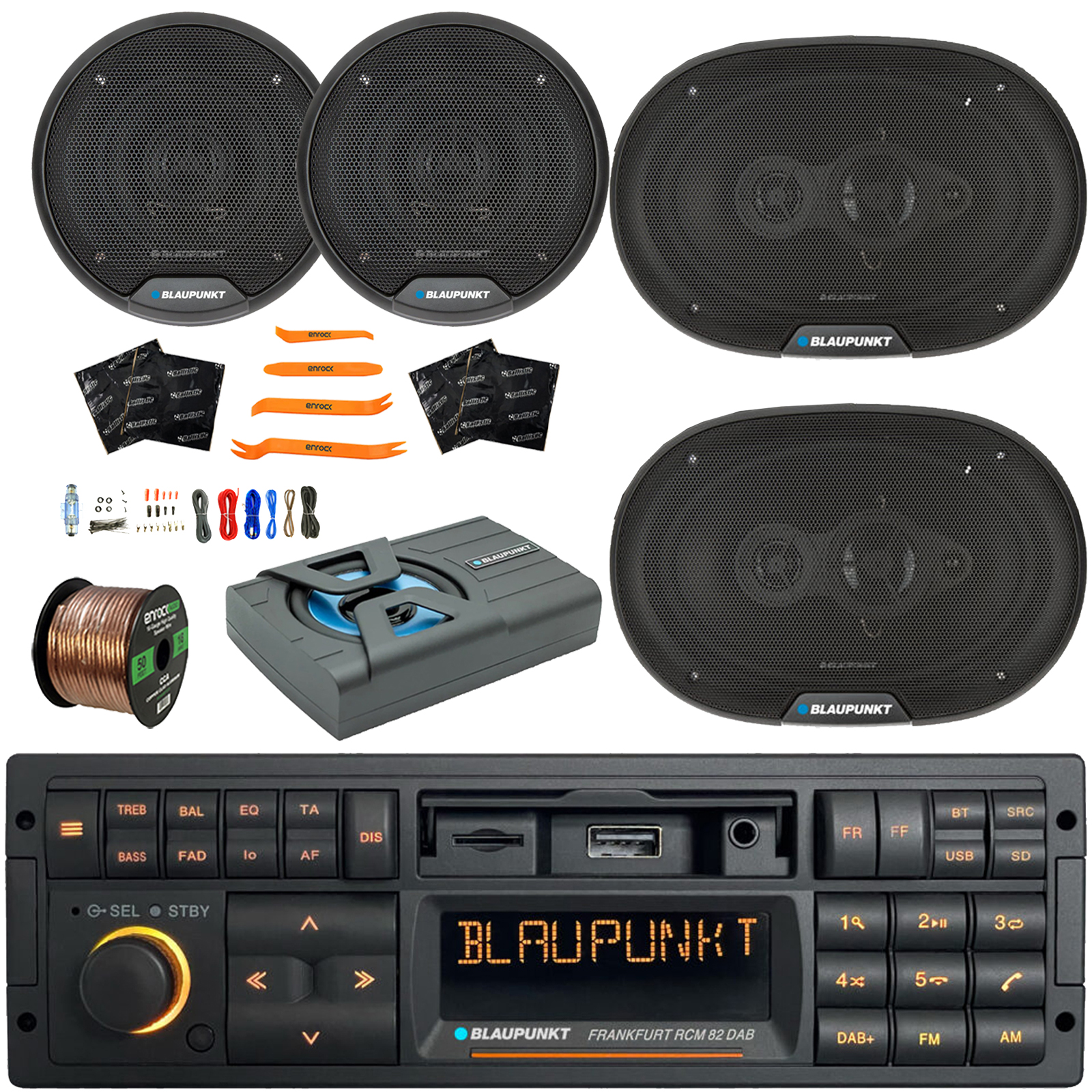 PACKAGE BUNDLE INCLUDES: Blaupunkt FRANKFURT Single DIN 90's Retro Classic Bluetooth USB AM/FM Radio Stereo Receiver, 2x Blaupunkt BPS-E653 6" 40 Watt Max Power Full Range 3-Way Car Audio Speakers, 2x Blaupunkt BPS-E694 6x9" 70 Watt Max Power 4-Way Speakers, Blaupunkt GTHS-80PRO 8" 320 Watt Max Slim Powered Under Seat Subwoofer Enclosure, 8 Gauge Amplifier Wiring Installation Kit, 50 Feet 16 Gauge Speaker Wire, 4x Speaker Sound Deadening Material, Pry Tool Set