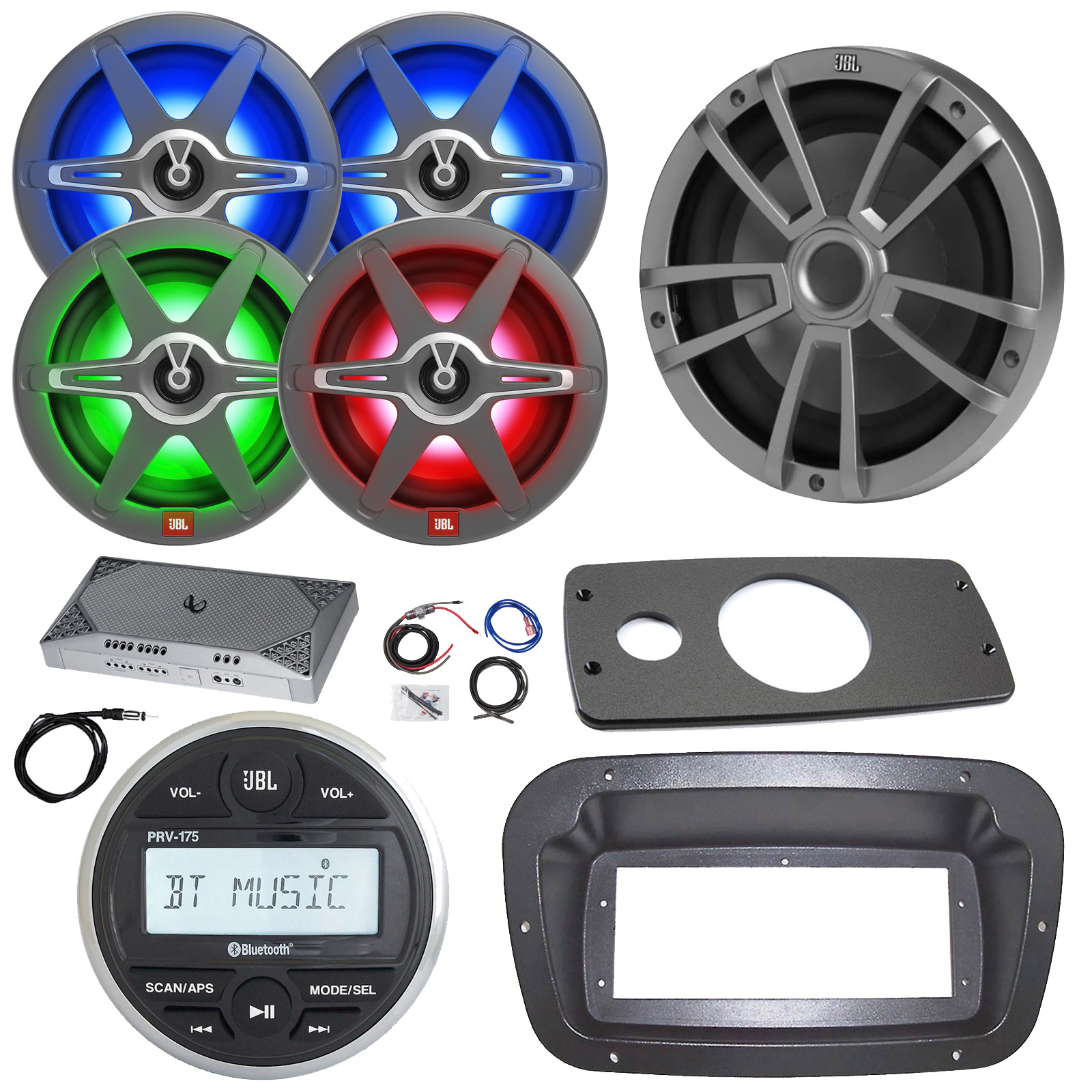 PACKAGE BUNDLE INCLUDES: JBL PRV-175 Marine Bluetooth USB/AUX AM/FM Radio Gauge Hole Mount Digital Media Stereo Receiver, Spa bezel for Single-DIN Receiver + Receiver Installation Kit Adaptor Plate, 4x JBL Club 82 OEM Replacement 8" 450W Max 2-Way High-Perfomance Boat RGB LED Speakers (White and Gray Grilles), JBL Stage Marine 10" 600W Max Gray Subwoofer (Single), Infinity M704A 4-Channel Compact Amplifier, 8 Gauge Amplifier Wiring Kit, 22" Radio Antenna