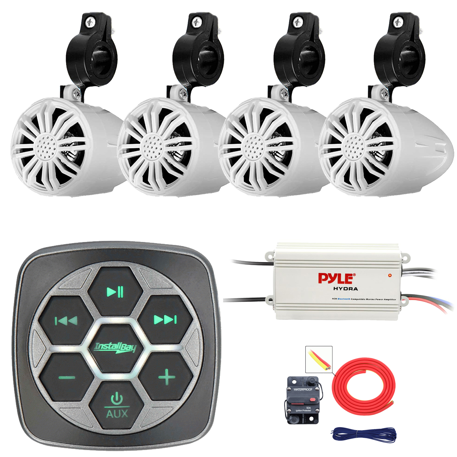 PACKAGE BUNDLE INCLUDES: Metra IBBTR19 Marine Bluetooth 3-Zone Controller, 4x Pyle PLMR22WT 2.25’' 10 Watt Max Power Waterproof Rated Full Range Off-Road Boat White Speakers, Pyle PLMRMB4CW 4-Channel Waterproof Bluetooth Amplifier, 8 Gauge Amplifier Installation Kit