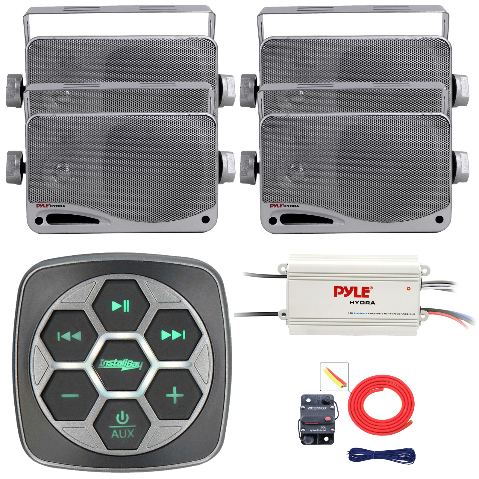 PACKAGE BUNDLE INCLUDES: Metra IBBTR19 Marine Bluetooth 3-Zone Controller, 4x Pyle PLMR24S 3.5'' 200 Watt Max Power 3-Way Weather Proof Mini Box Silver Speakers, Pyle PLMRMB4CW 4-Channel Waterproof Bluetooth Amplifier, 8 Gauge Amplifier Installation Kit