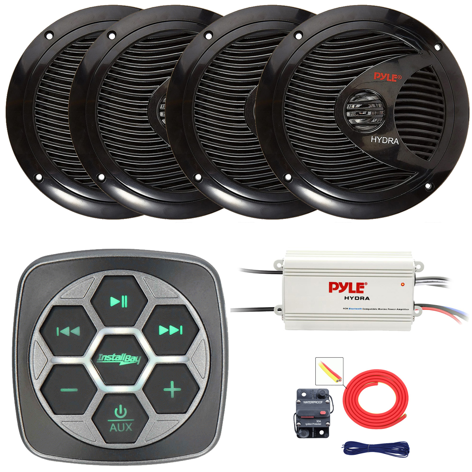 • PACKAGE BUNDLE INCLUDES: Metra IBBTR19 Marine Bluetooth 3-Zone Controller, 4x Pyle PLMR80B 8'' 180 Watt Max Power Waterproof Full Range Stereo Boat Black Speakers, Pyle PLMRMB4CW 4-Channel Waterproof Bluetooth Amplifier, 8 Gauge Amplifier Installation Kit