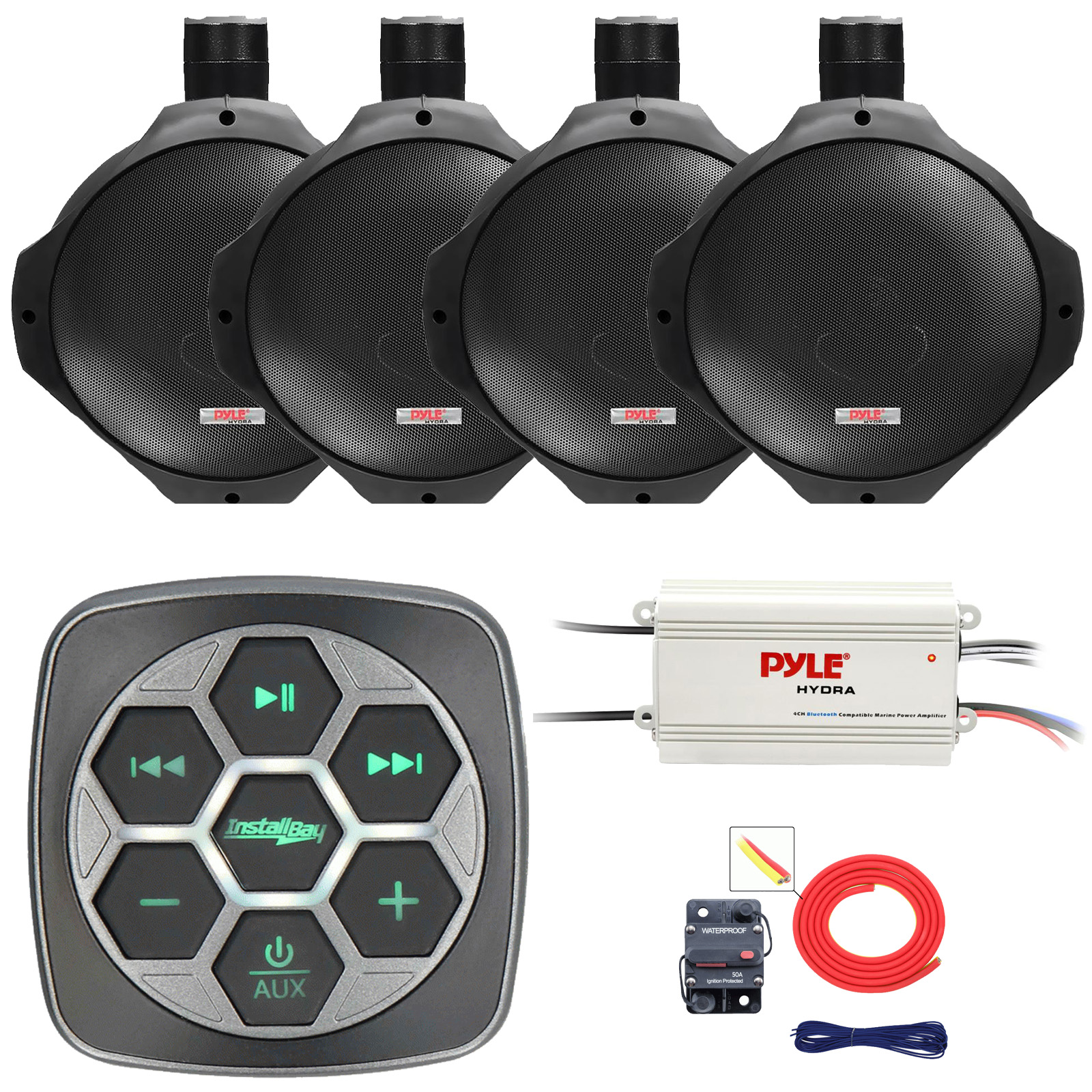 PACKAGE BUNDLE INCLUDES: Metra IBBTR19 Marine Bluetooth 3-Zone Controller, 4x Pyle PLMRB65 6.5" 200 Watts Max Water Resistant Full Range Wakeboard Boat Audio Black Speakers, Pyle PLMRMB4CW 4-Channel Waterproof Bluetooth Amplifier, 8 Gauge Amplifier Installation Kit