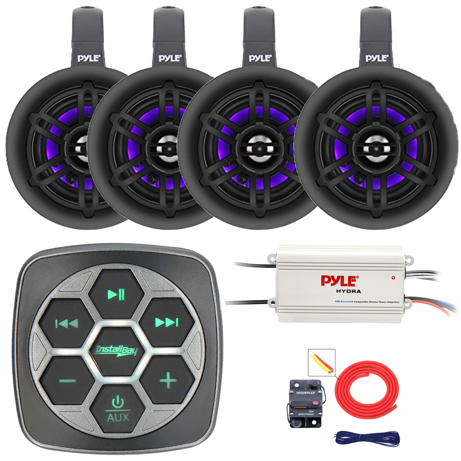 • PACKAGE BUNDLE INCLUDES: Metra IBBTR19 Marine Bluetooth 3-Zone Controller, 4x Pyle PLMRLEWB47BB 4" 300 Watts Max Power Bluetooth Waterproof Boat Wakeboard LED Tower Black Speakers, Pyle PLMRMB4CW 4-Channel Waterproof Bluetooth Amplifier, 8 Gauge Amplifier Installation Kit