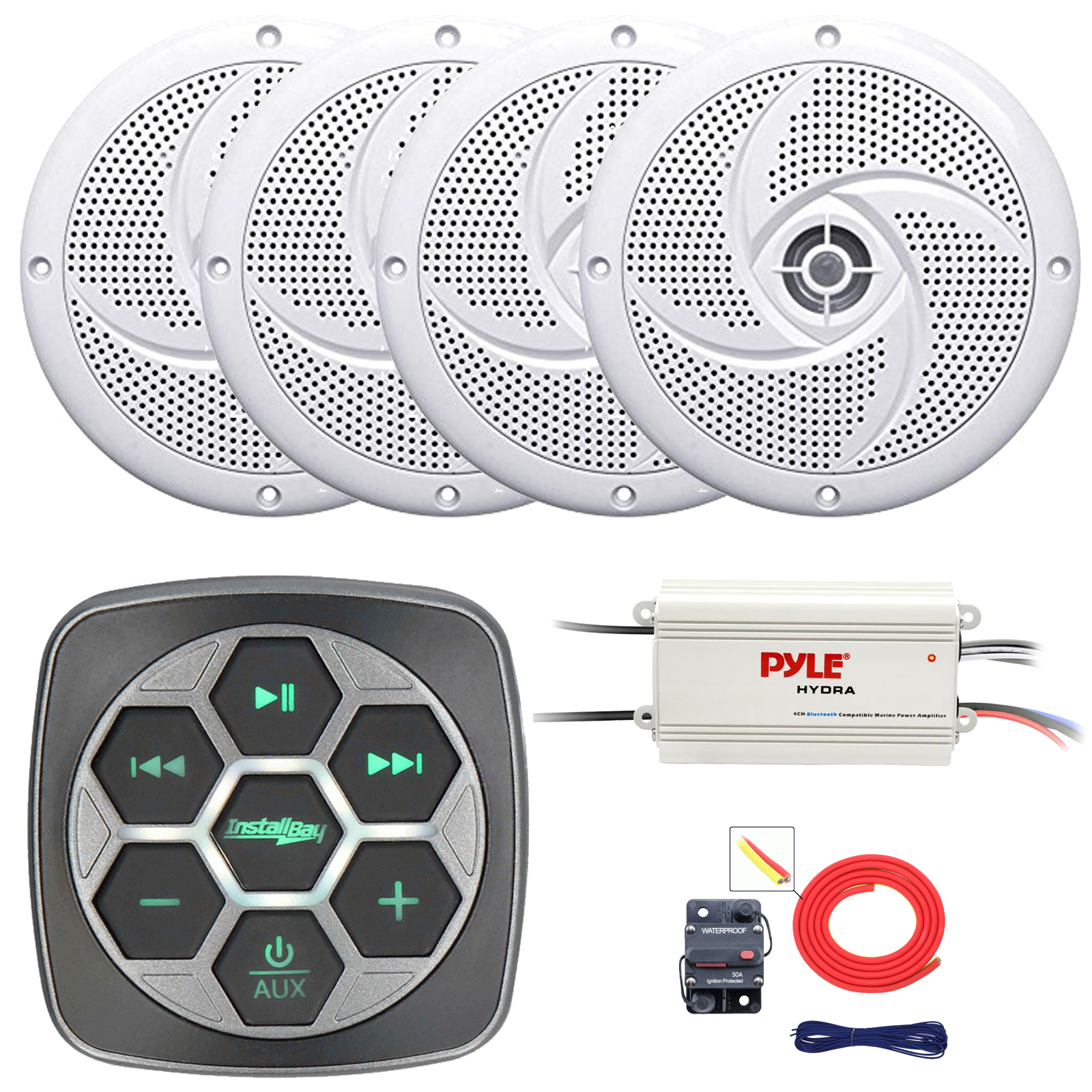 PACKAGE BUNDLE INCLUDES: Metra IBBTR19 Marine Bluetooth 3-Zone Controller, 4x Pyle PLMRS5W 5.25" 180 Watt Max Power 2-Way Waterproof Low Profile Slim Style Boat Audio White Speakers, Pyle PLMRMB4CW 4-Channel Waterproof Bluetooth Amplifier, 8 Gauge Amplifier Installation Kit