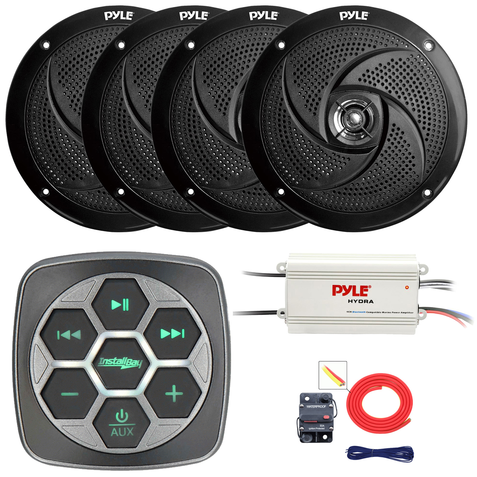 PACKAGE BUNDLE INCLUDES: Metra IBBTR19 Marine Bluetooth 3-Zone Controller, 4x Pyle PLMRS8B 8'' 320 Watt Max Power Low Profile 2-Way Boat Black Speakers, Pyle PLMRMB4CW 4-Channel Waterproof Bluetooth Amplifier, 8 Gauge Amplifier Installation Kit