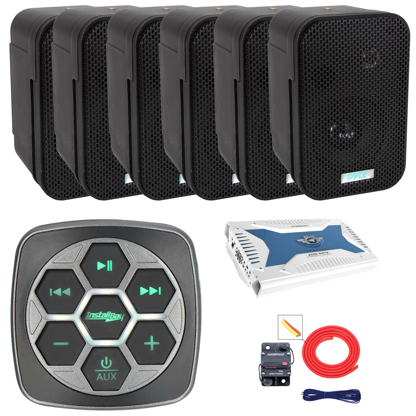 PACKAGE BUNDLE INCLUDES: Metra IBBTR19 Marine Bluetooth 3-Zone Controller, 6x Pyle PDWR30B 3.5" 300 Watts Max Power Indoor/Outdoor Black Waterproof Speakers, Pyle PLMRA630BT 6-Channel 2000 Watt Bluetooth Amplifier, 8 Gauge Amplifier Installation Kit