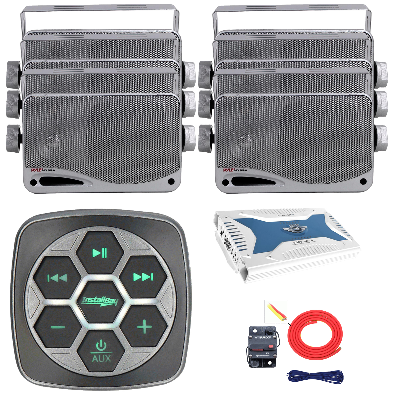 PACKAGE BUNDLE INCLUDES: Metra IBBTR19 Marine Bluetooth 3-Zone Controller, 6x Pyle PLMR24S 3.5'' 200 Watt Max Power 3-Way Weather Proof Mini Box Silver Speakers, Pyle PLMRA630BT 6-Channel 2000 Watt Bluetooth Amplifier, 8 Gauge Amplifier Installation Kit