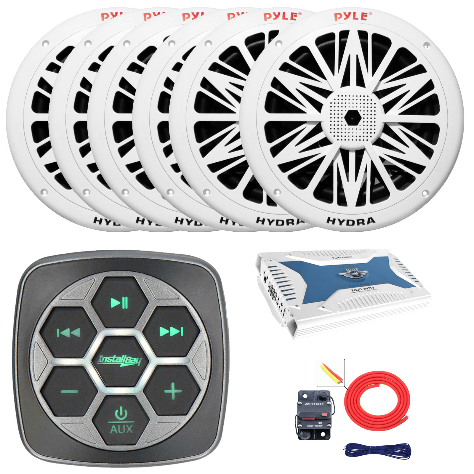 PACKAGE BUNDLE INCLUDES: Metra IBBTR19 Marine Bluetooth 3-Zone Controller, 6x Pyle PLMR82 8" 300 Watts Max Power 2 Way White Boat Speakers, Pyle PLMRA630BT 6-Channel 2000 Watt Bluetooth Amplifier, 8 Gauge Amplifier Installation Kit