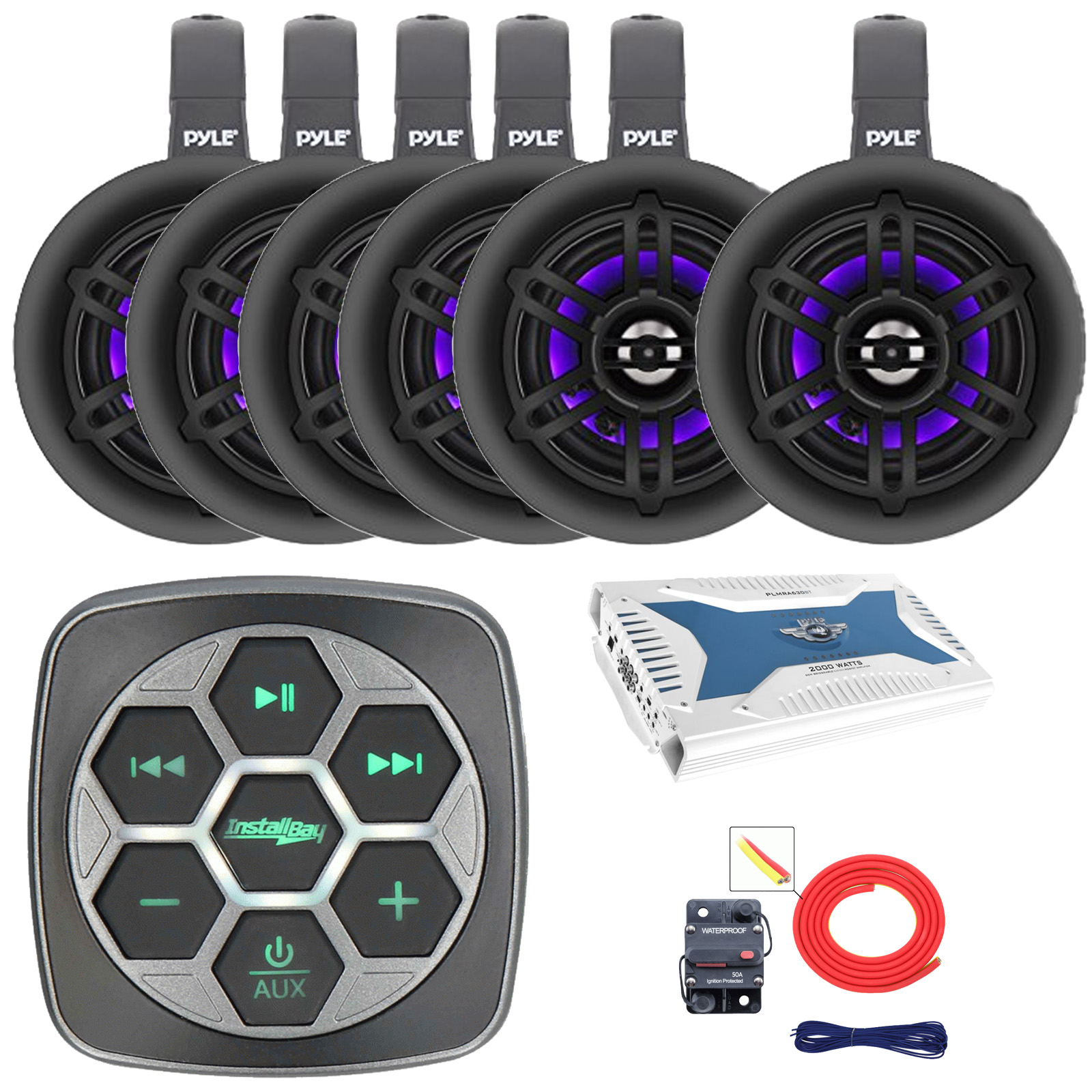 PACKAGE BUNDLE INCLUDES: Metra IBBTR19 Marine Bluetooth 3-Zone Controller, 6x Pyle PLMRLEWB47BB 4" 300 Watts Max Power Bluetooth Waterproof Boat Wakeboard LED Tower Black Speakers, Pyle PLMRA630BT 6-Channel 2000 Watt Bluetooth Amplifier, 8 Gauge Amplifier Installation Kit