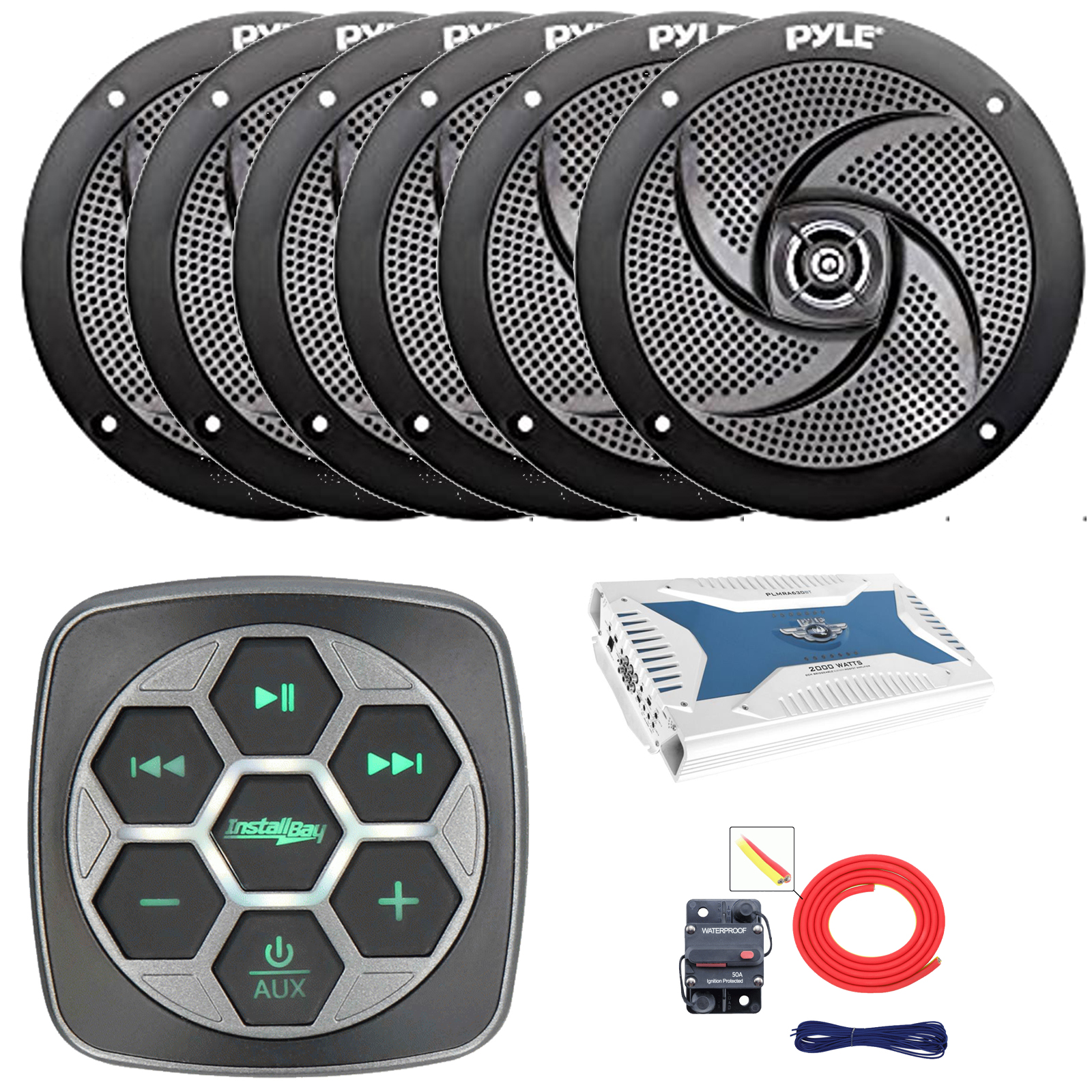 PACKAGE BUNDLE INCLUDES: Metra IBBTR19 Marine Bluetooth 3-Zone Controller, 6x Pyle PLMRS5B 5.25" 180 Watt Max Power 2-Way Waterproof Low Profile Slim Style Boat Audio Black Speakers, Pyle PLMRA630BT 6-Channel 2000 Watt Bluetooth Amplifier, 8 Gauge Amplifier Installation Kit