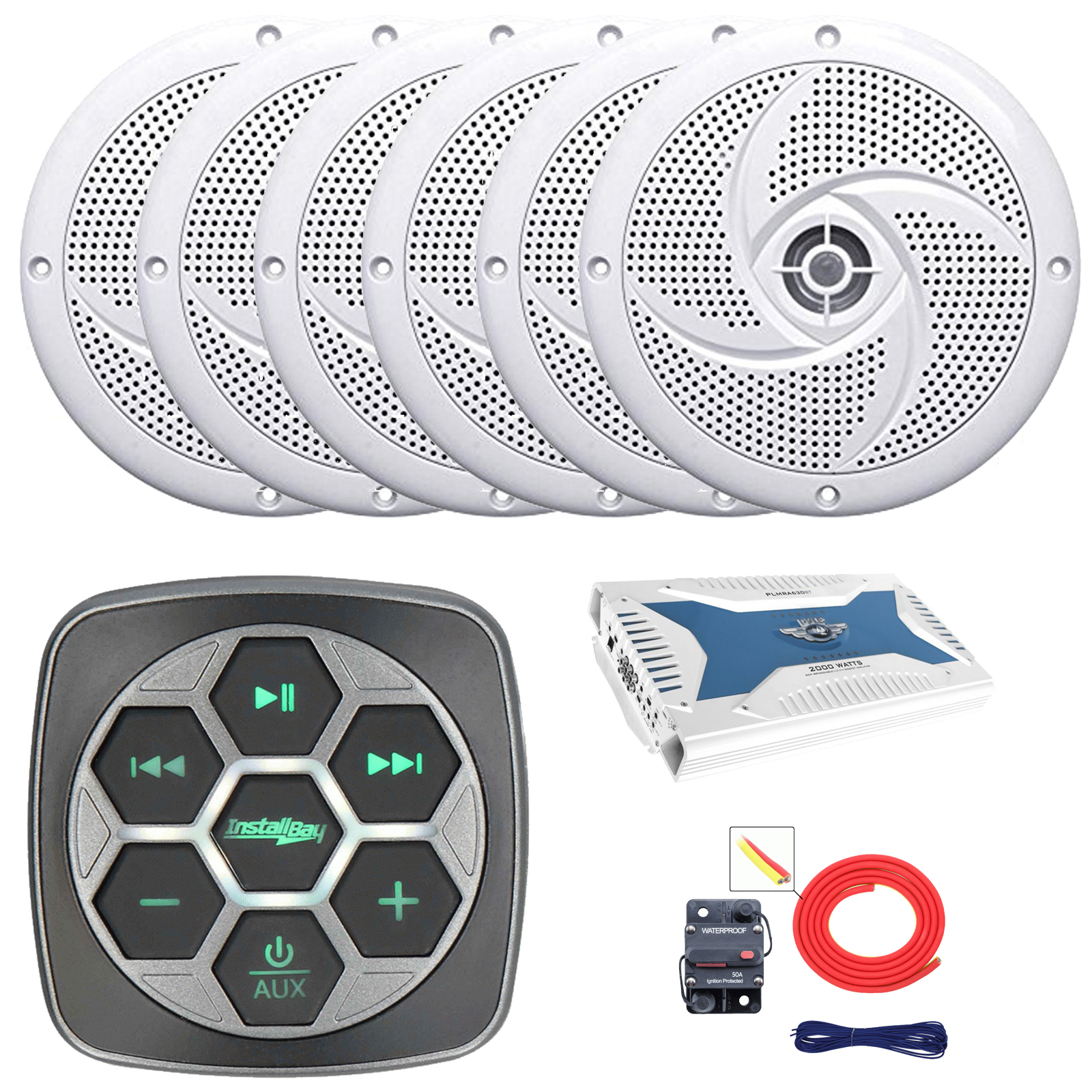 PACKAGE BUNDLE INCLUDES: Metra IBBTR19 Marine Bluetooth 3-Zone Controller, 6x Pyle PLMRS5W 5.25" 180 Watt Max Power 2-Way Waterproof Low Profile Slim Style Boat Audio White Speakers, Pyle PLMRA630BT 6-Channel 2000 Watt Bluetooth Amplifier, 8 Gauge Amplifier Installation Kit