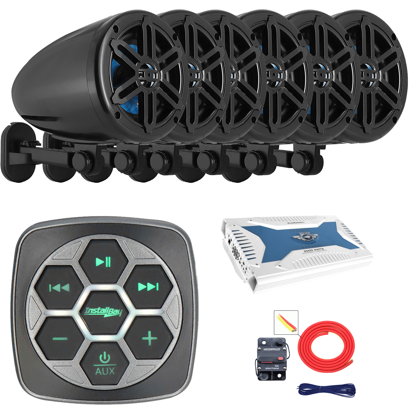 PACKAGE BUNDLE INCLUDES: Metra IBBTR19 Marine Bluetooth 3-Zone Controller, 6x Pyle PLMRWK59BK 5.25’’ 180 Watts Max Power 2-Way Waterproof Rated Off-Road Boat Black Speakers, Pyle PLMRA630BT 6-Channel 2000 Watt Bluetooth Amplifier, 8 Gauge Amplifier Installation Kit
