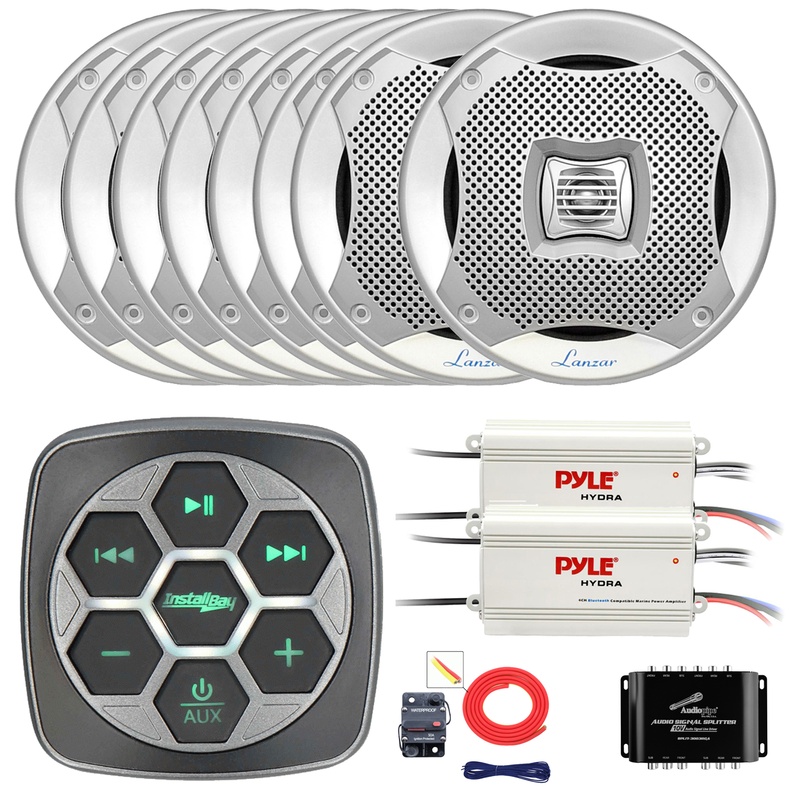 • PACKAGE BUNDLE INCLUDES: Metra IBBTR19 Marine Bluetooth 3-Zone Controller, 8x Lanzar AQ5CXS 5.25” 400 Watts Max Power 2-Way Water Resistant Boat Audio Stereo Silver Speakers, 2x Pyle PLMRMB4CW 4-Channel Waterproof Bluetooth Amplifier, Signal Splitter Amplifier 3 Rca Outputs W/ Built in 10 Volt Line Driver, 8 Gauge Amplifier Install Kit