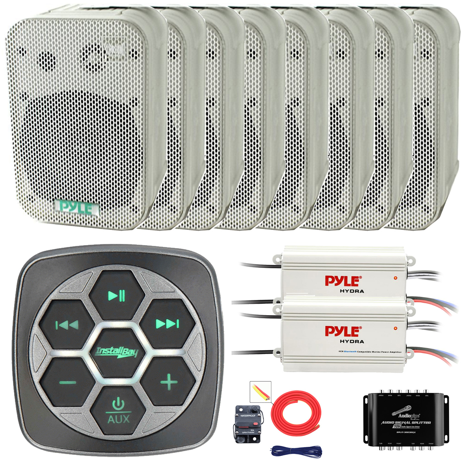 PACKAGE BUNDLE INCLUDES: Metra IBBTR19 Marine Bluetooth 3-Zone Controller, 8x Pyle PDWR40W 5.25" 400 Watts Max Power Indoor/Outdoor White Waterproof Speakers, 2x Pyle PLMRMB4CW 4-Channel Waterproof Bluetooth Amplifier, Signal Splitter Amplifier 3 Rca Outputs W/ Built in 10 Volt Line Driver, 8 Gauge Amplifier Install Kit