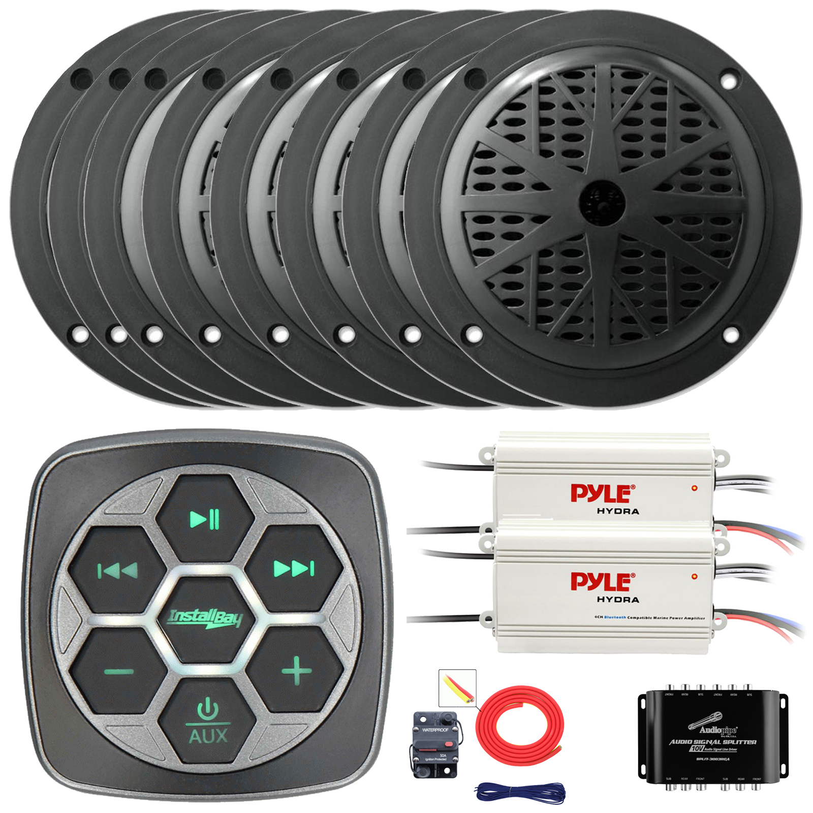 PACKAGE BUNDLE INCLUDES: Metra IBBTR19 Marine Bluetooth 3-Zone Controller, 8x Pyle PLMR41B 4'' 100 Watt Max Power Dual Cone Waterproof Stereo Black Speakers, 2x Pyle PLMRMB4CW 4-Channel Waterproof Bluetooth Amplifier, Signal Splitter Amplifier 3 Rca Outputs W/ Built in 10 Volt Line Driver, 8 Gauge Amplifier Install Kit