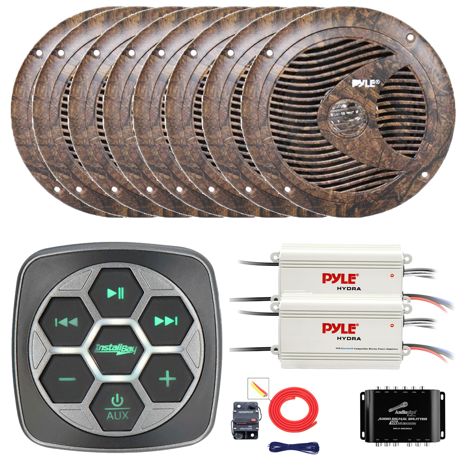 PACKAGE BUNDLE INCLUDES: Metra IBBTR19 Marine Bluetooth 3-Zone Controller, 8x Pyle PLMR60DK 6.5'' 150 Watts Max Power Full Range Camouflage Waterproof Boat Stereo Speakers, 2x Pyle PLMRMB4CW 4-Channel Waterproof Bluetooth Amplifier, Signal Splitter Amplifier 3 Rca Outputs W/ Built in 10 Volt Line Driver, 8 Gauge Amplifier Install Kit