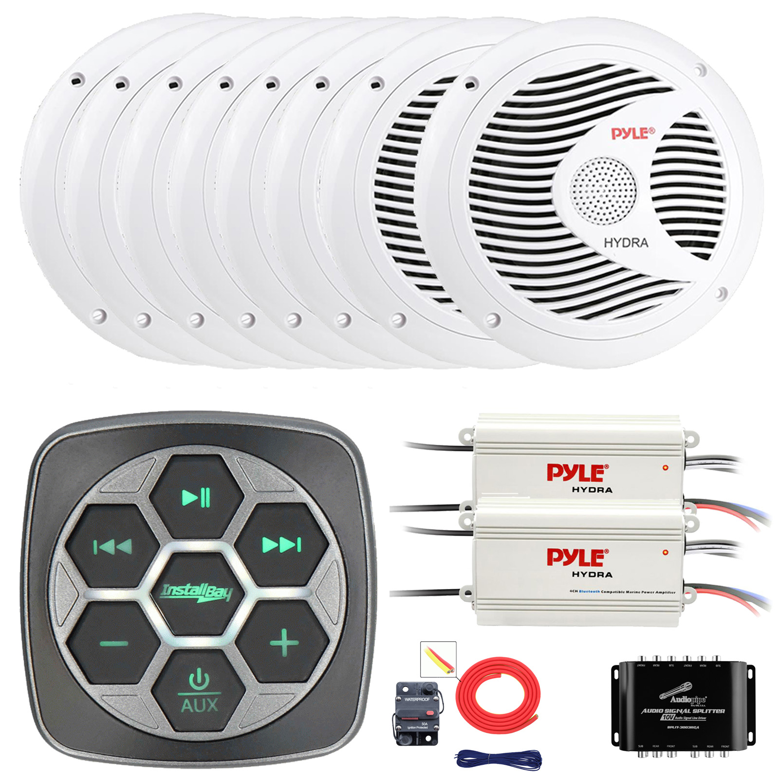 PACKAGE BUNDLE INCLUDES: Metra IBBTR19 Marine Bluetooth 3-Zone Controller, 8x Pyle PLMR60W 6.5" 150 Watt Max Power Full Range Dual Cone Waterproof Boat Stereo White Speakers, 2x Pyle PLMRMB4CW 4-Channel Waterproof Bluetooth Amplifier, Signal Splitter Amplifier 3 Rca Outputs W/ Built in 10 Volt Line Driver, 8 Gauge Amplifier Install Kit