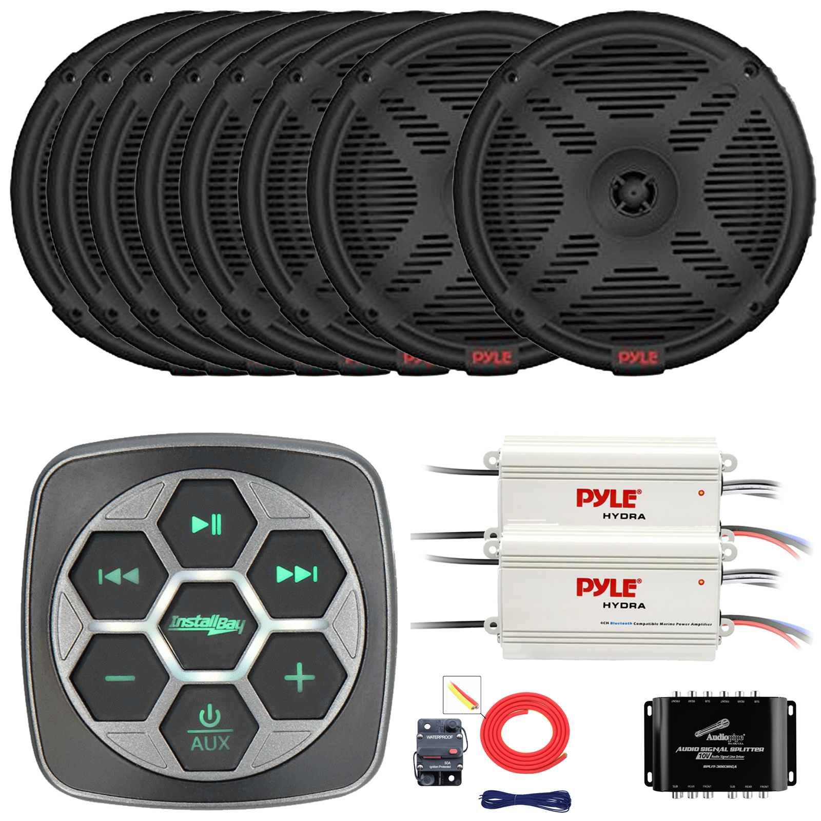 PACKAGE BUNDLE INCLUDES: Metra IBBTR19 Marine Bluetooth 3-Zone Controller, 8x Pyle PLMR652B 6.5" 600 Watt Max Power 2-Way Coaxial Full-Range Boat Black Speakers, 2x Pyle PLMRMB4CW 4-Channel Waterproof Bluetooth Amplifier, Signal Splitter Amplifier 3 Rca Outputs W/ Built in 10 Volt Line Driver, 8 Gauge Amplifier Install Kit