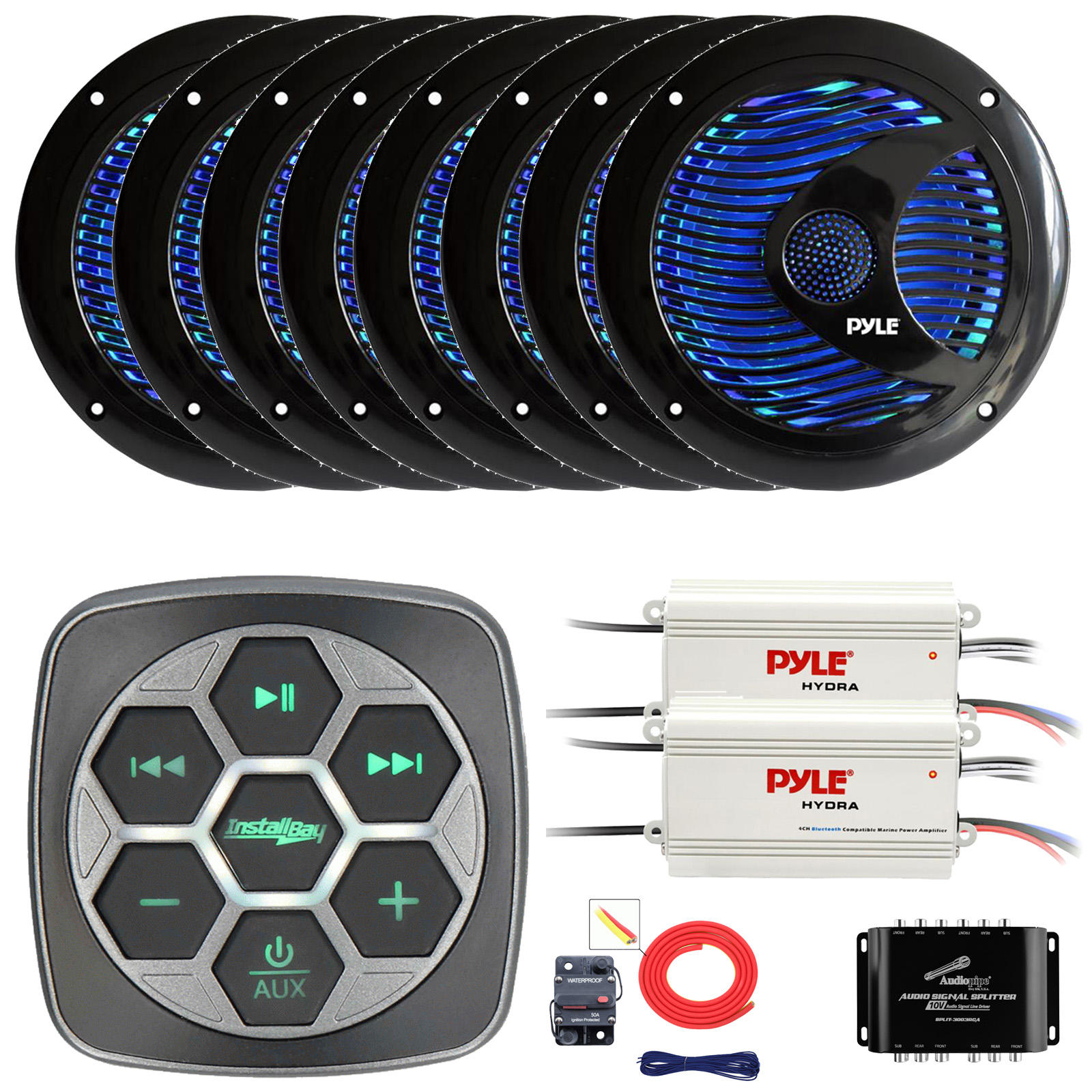 PACKAGE BUNDLE INCLUDES: Metra IBBTR19 Marine Bluetooth 3-Zone Controller, 8x Pyle PLMR6LEB 6.5'' 150 Watt Max Power Dual Cone RGB LED Boat Audio Black Speakers, 2x Pyle PLMRMB4CW 4-Channel Waterproof Bluetooth Amplifier, Signal Splitter Amplifier 3 Rca Outputs W/ Built in 10 Volt Line Driver, 8 Gauge Amplifier Install Kit