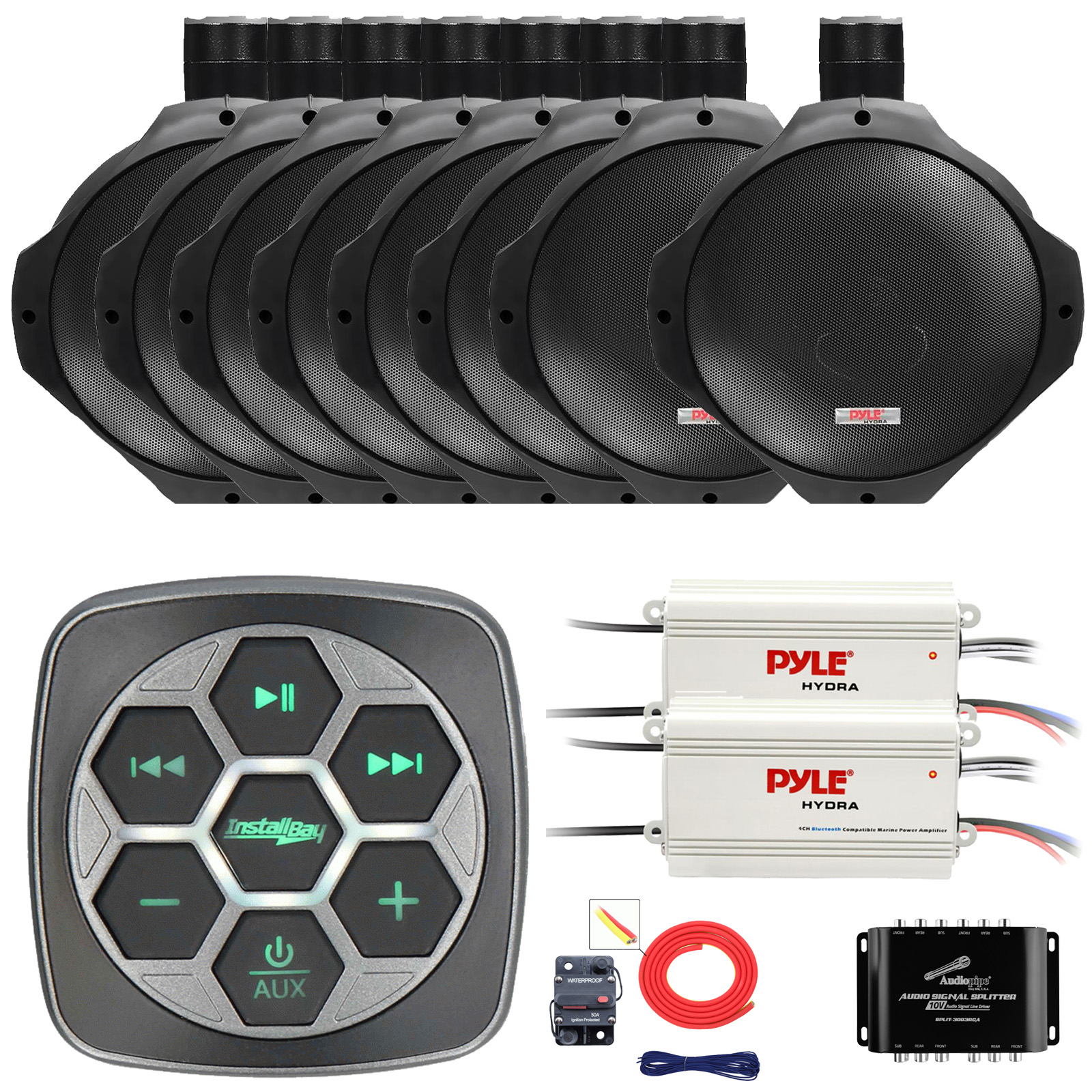 PACKAGE BUNDLE INCLUDES: Metra IBBTR19 Marine Bluetooth 3-Zone Controller, 8x Pyle PLMRB65 6.5" 200 Watts Max Water Resistant Full Range Wakeboard Boat Audio Black Speakers, 2x Pyle PLMRMB4CW 4-Channel Waterproof Bluetooth Amplifier, Signal Splitter Amplifier 3 Rca Outputs W/ Built in 10 Volt Line Driver, 8 Gauge Amplifier Install Kit