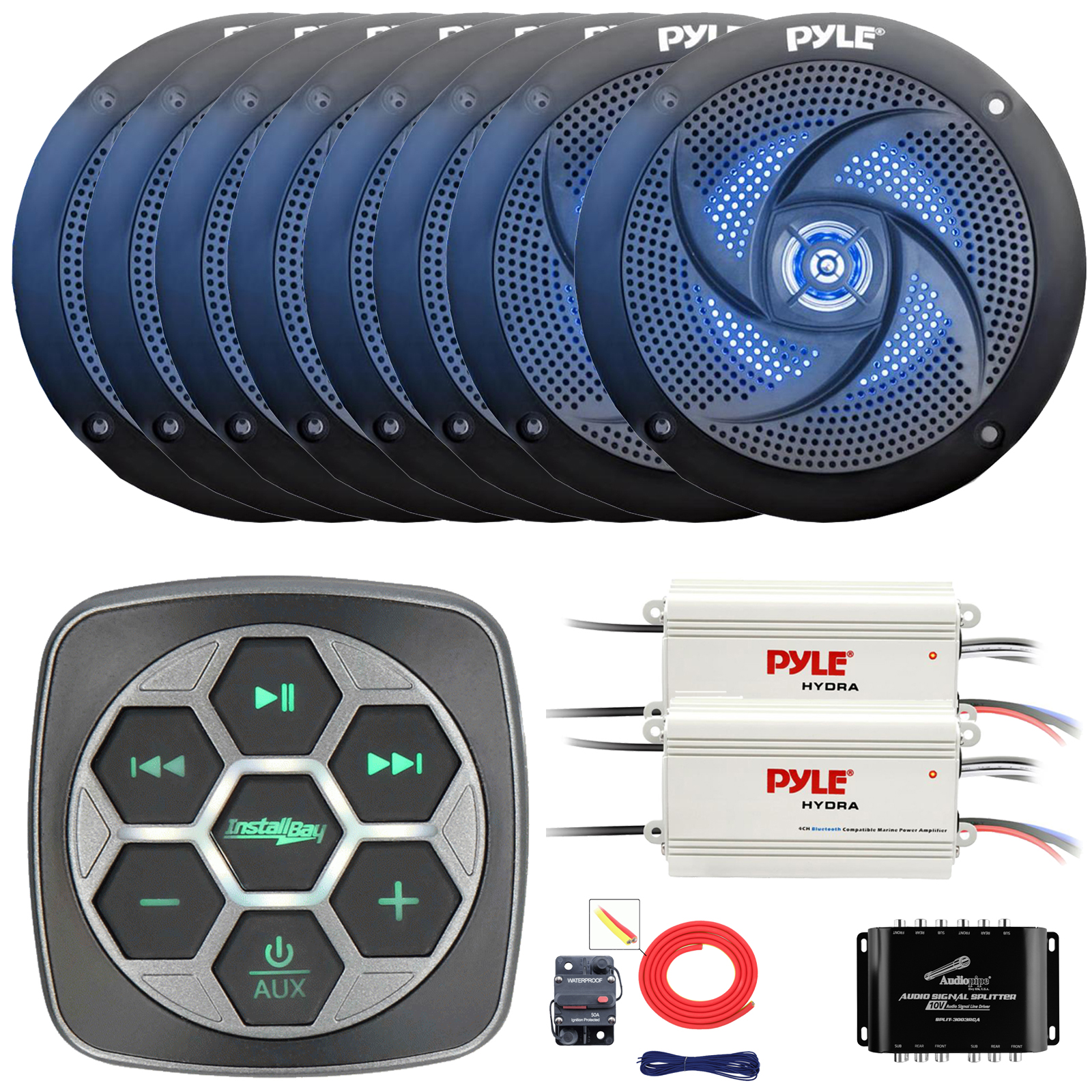 PACKAGE BUNDLE INCLUDES: Metra IBBTR19 Marine Bluetooth 3-Zone Controller, 8x Pyle PLMRS43BL 4" 100 Watt Max Power 2-Way Low Profile Blue Flashing LED Boat Audio Speakers, 2x Pyle PLMRMB4CW 4-Channel Waterproof Bluetooth Amplifier, Signal Splitter Amplifier 3 Rca Outputs W/ Built in 10 Volt Line Driver, 8 Gauge Amplifier Install Kit