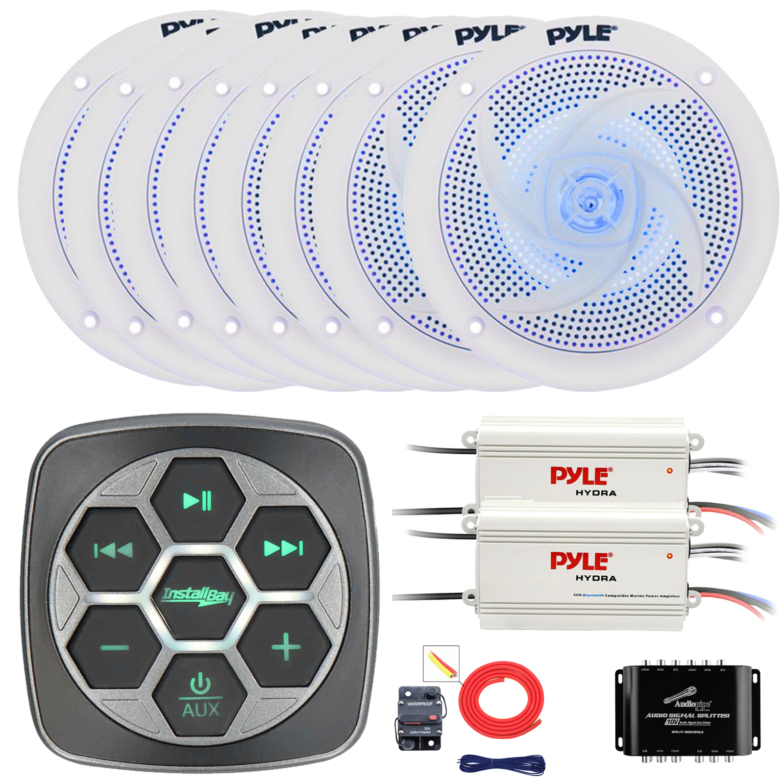PACKAGE BUNDLE INCLUDES: Metra IBBTR19 Marine Bluetooth 3-Zone Controller, 8x Pyle PLMRS43WL 4" 100 Watt Max Power Low Profile 2-Way Blue Light LED Boat Audio White Speakers, 2x Pyle PLMRMB4CW 4-Channel Waterproof Bluetooth Amplifier, Signal Splitter Amplifier 3 Rca Outputs W/ Built in 10 Volt Line Driver, 8 Gauge Amplifier Install Kit
