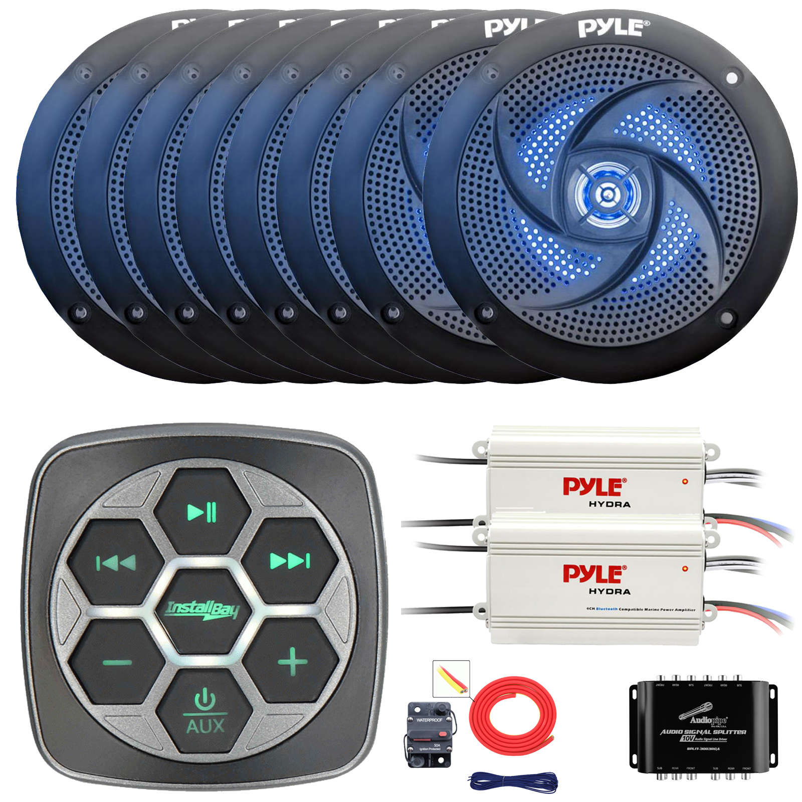 PACKAGE BUNDLE INCLUDES: Metra IBBTR19 Marine Bluetooth 3-Zone Controller, 8x Pyle PLMRS63BL 6'' 240 Watt Max Power Low Profile 2-Way Blue Flashing LED Boat Black Speakers, 2x Pyle PLMRMB4CW 4-Channel Waterproof Bluetooth Amplifier, Signal Splitter Amplifier 3 Rca Outputs W/ Built in 10 Volt Line Driver, 8 Gauge Amplifier Install Kit
